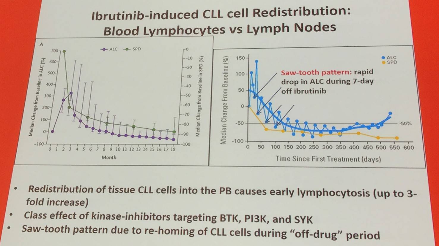 It appears that ibrutinib has a dual action that inhibits proliferation and accelerates CLL cell death via two different mechanisms: