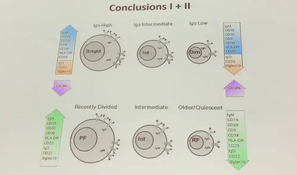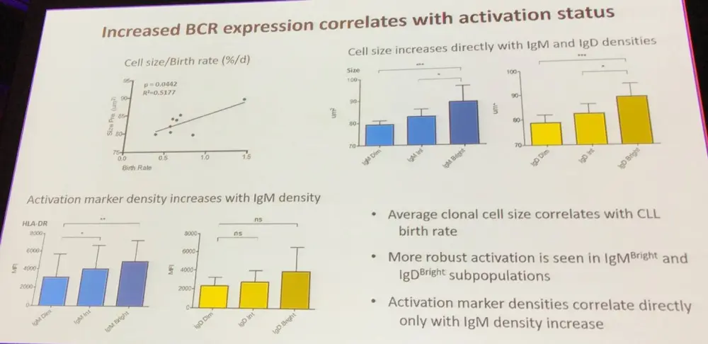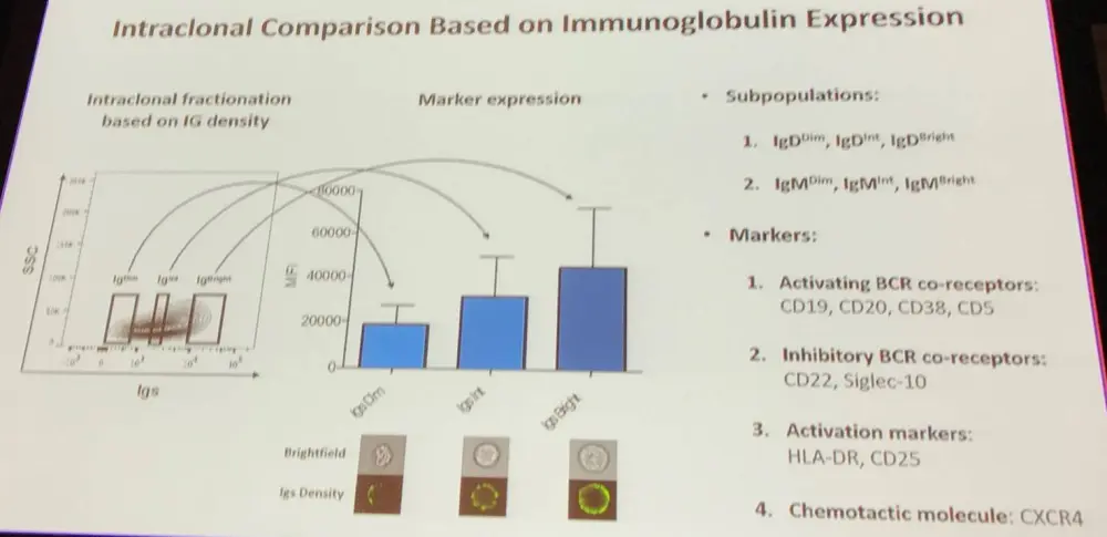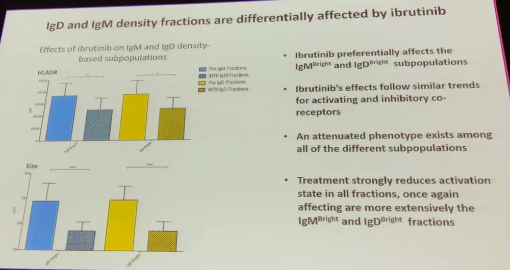 The group compared densities of IgM and IgD, as well as Ig associated stimulatory/inhibitory co-receptors, on the surface membranes of CLL B-cells. Conventional and imaging flow cytometry was performed on samples taken from 5 Unmutated IGHV CLL (U-CLL) and Mutated IGHV CLL (M-CLL) patients before and during ibrutinib treatment. Cell size was used as an indicator of metabolic activity in the cell subpopulations.