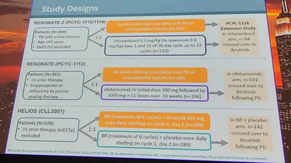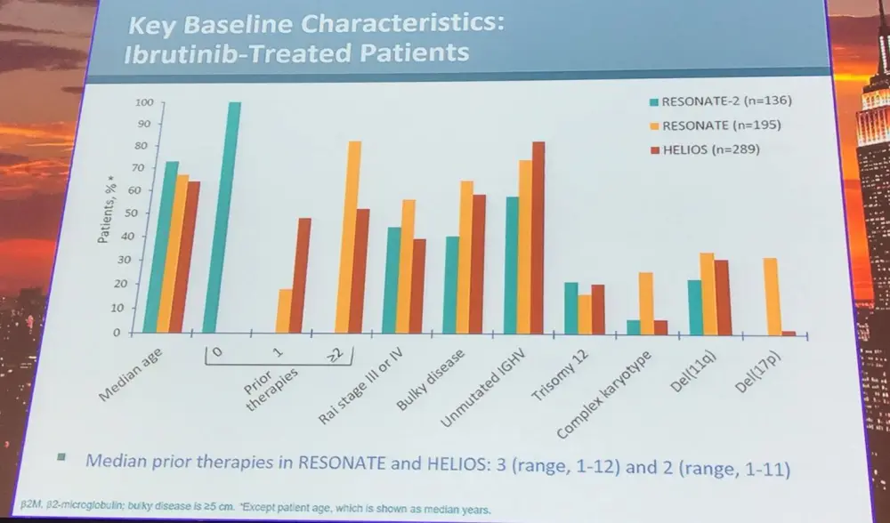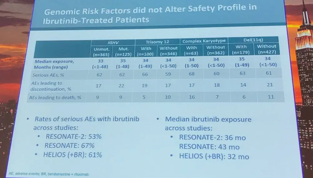 Data from the RESONATE, RESONATE-2, and HELIOS trials were pooled and analyzed based on IGHV mutational status, del(11q), trisomy 12, and complex karyotype. Impact of del(17p) was not assessed for efficacy analyses as patients with this genetic abnormality were excluded from two of the three trials. PFS for comparator patients was also included to provide context. Multivariate analysis was undertaken to determine the risk/prognostic factors associated with PFS.