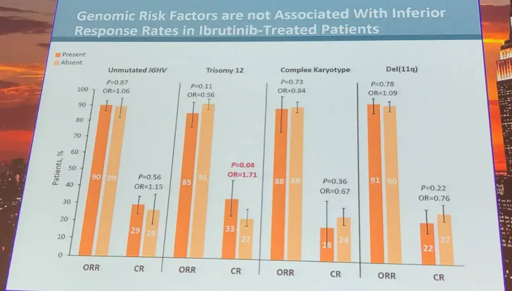 Thomas J. Kipps concluded the talk by stating that ibrutinib-treated patients with trisomy 12 had significantly higher CR rate; however, PFS and OS were similar compared to those without trisomy 12. Unmutated IGHV, del(11q), and complex karyotype were adverse prognostic factors for PFS in comparator-treated patients, but not in those treated with ibrutinib. This integrated analysis found that patients with del(11q) had longer PFS than patients without del(11q). Lastly, results suggest that genomic risk factors associated with poor outcomes with traditional therapies have less relevance with ibrutinib treatment.