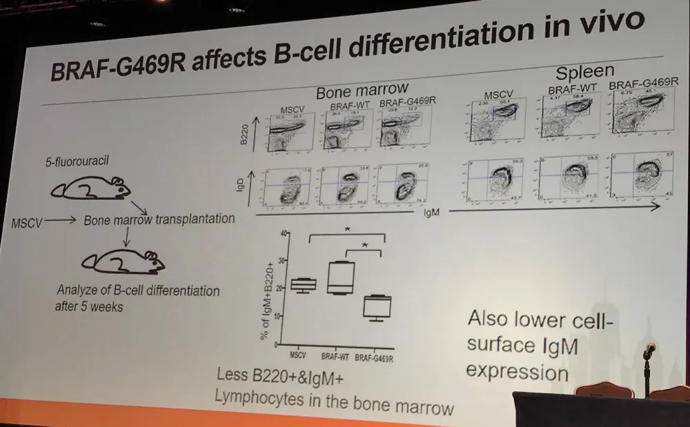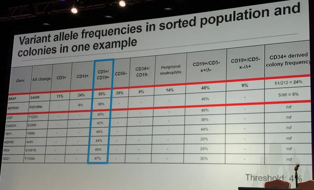 In progenitors, most mutated genes are oncogenes and have been found to be recurrently mutated in hematological malignancies. These “early” mutations drive clonal dominance; however, Bernard asked if they affect B-cell differentiation/maturation?