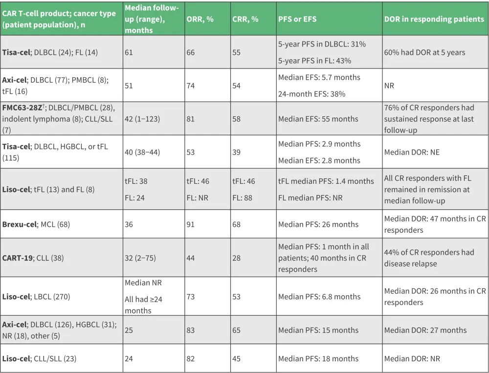 axi-cel, axicabtagene ciloleucel; CAR, chimeric antigen receptor; CRR, complete remission rate; CLL, chronic lymphocytic leukemia; DLBCL, diffuse large B-cell lymphoma; DOR, duration of response; EFS, event free survival; FL, follicular lymphoma; HGBCL, high-grade B-cell lymphoma; liso-cel, lisocabtagene maraleucel; MCL, mantle cell lymphoma; NR, not reported; PFS, progression-free survival; PMBCL, primary mediastinal large B-cell lymphoma; SLL, small lymphocytic leukemia; tFL, transformed follicular lymphoma; tisa-cel, tisagenlecleucel.
