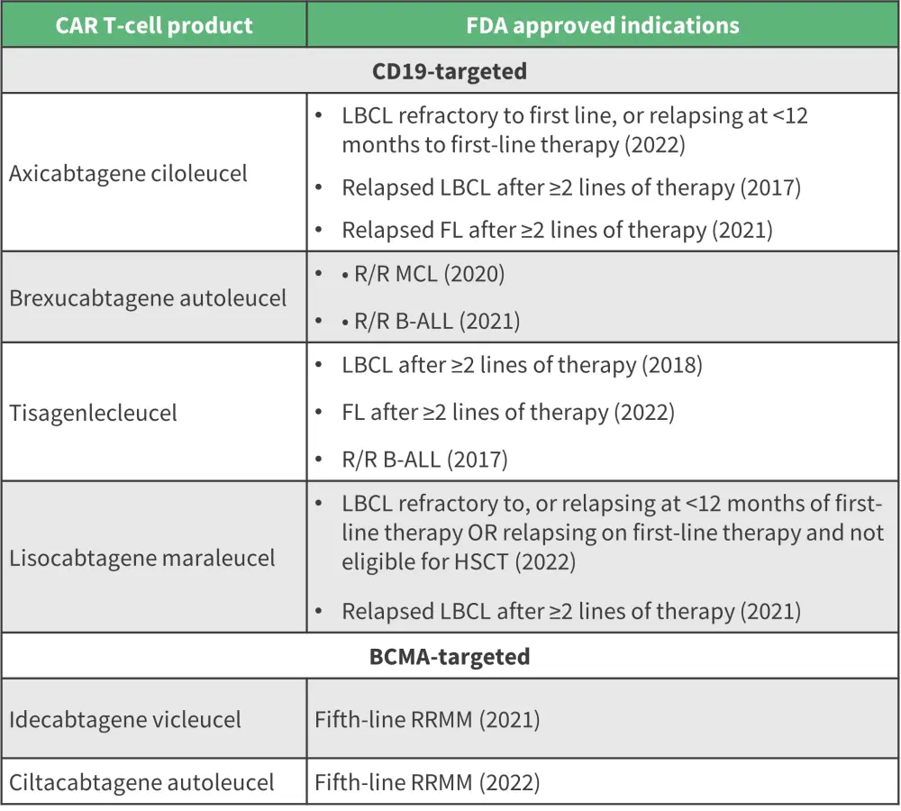 These improved outcomes resulted in the U.S. Food and Drug Administration (FDA) approval of four CD19-targeted CAR T-cell therapies: axicabtagene ciloleucel (axi-cel), lisocabtagene maraleucel (liso-cel), tisagenlecleucel (tisa-cel), and brexucabtagene autoleucel (brexu-cel) for R/R B-cell lymphomas; the latter two are indicated in B-cell acute lymphoblastic leukemia (ALL). Two B-cell maturation antigen (BCMA)-targeted CAR T-cell therapies, idecabtagene vicleucel and cilta-cabtagene autoleucel (cilta-cel), have been FDA approved for RRMM. These CAR T-cell products share similar adverse effects with variable differences.1