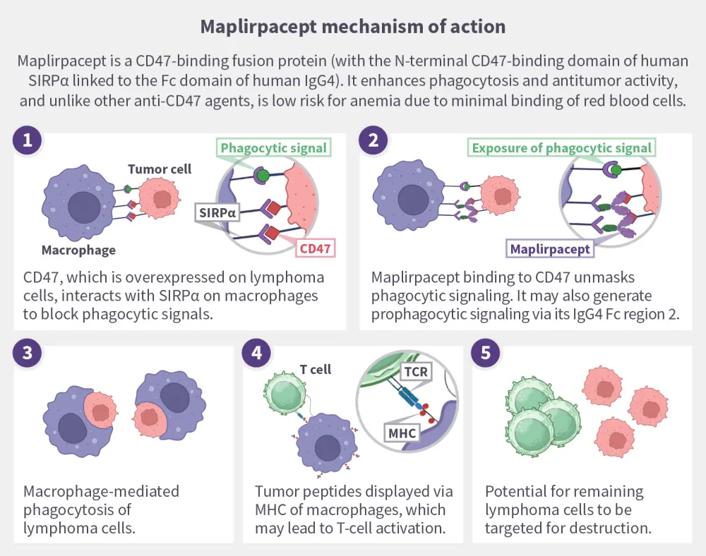 Maplirpacept is a CD47-binding fusion protein that enhances phagocytosis and antitumor activity.1 Unlike many other anti-CD47 agents, it binds minimally to red blood cells, reducing the risk of potential complications such as anemia.1,2
