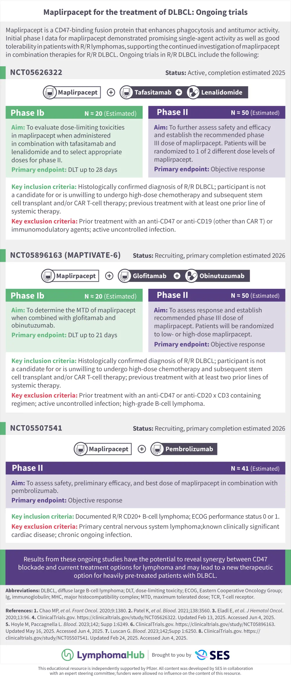 Previously, a phase I dose-escalation and expansion trial of maplirpacept (NCT03530683) investigated the safety of eight doses, ranging from 0.05 to 18 mg/kg weekly, in 42 patients with relapsed or refractory lymphoma.2,3 As of April 2021, treatment-related adverse events (AEs) occurred in 47% patients; with most AEs being Grade 1 or 2 and reversible.4 The most common treatment-related AEs included thrombocytopenia (21%), neutropenia (12%), and anemia and fatigue (both 9%).4 At data cut-off (April 12, 2021), objective responses were achieved in nine patients, including two complete responses.4 Positive results from this trial have led to further investigation of maplirpacept. Studies are now investigating maplirpacept in combination with various approved agents for lymphoma. Here, we summarize these ongoing studies and the mechanism of action of maplirpacept.