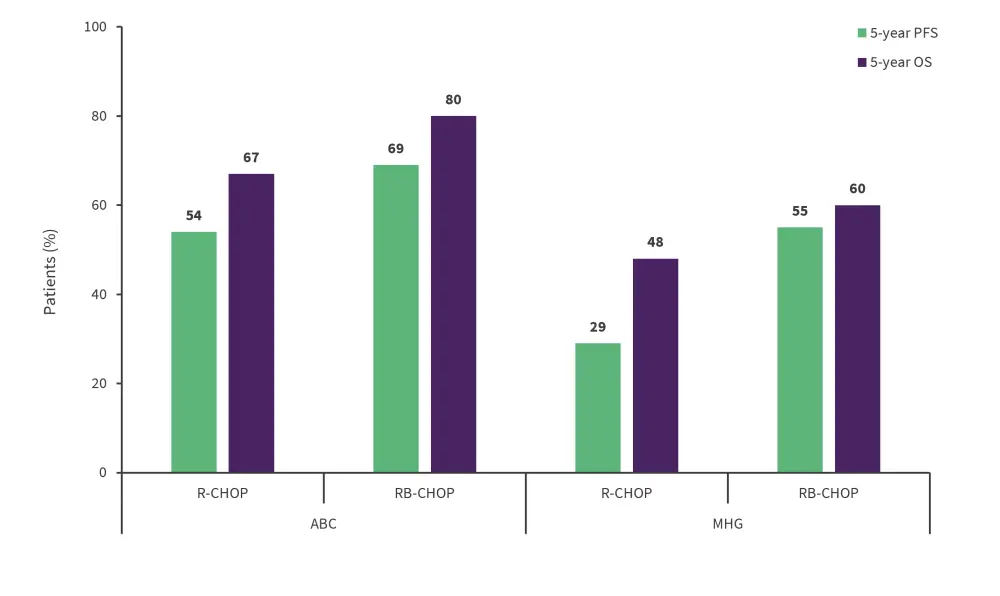 At a median follow-up of 60 months, there was no overall difference in PFS and OS between R-CHOP and RB-CHOP groups;