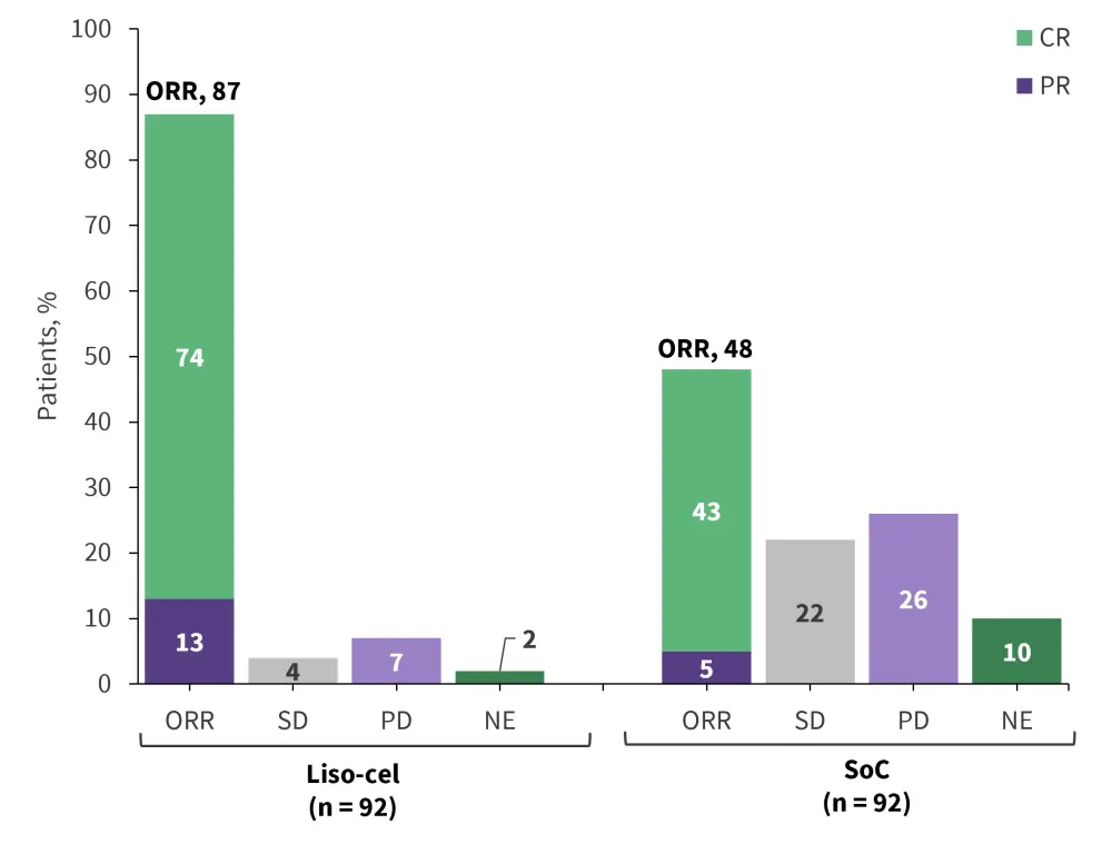 CR, complete response; liso-cel, lisocabtagene maraleucel; ORR, overall response rate; NE, not evaluable; PD, progressive disease; PR, partial response; SD, stable disease; SoC, standard of care.