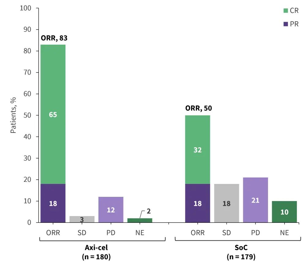 Axi-cel, axicabtagene ciloleucel; CR, complete response; NE, not evaluable; ORR, overall response rate; PD, progressive disease; PR, partial response; SD, stable disease.