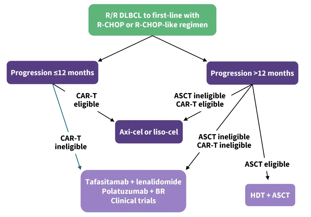 In recent years, the number of options available for patients with R/R DLBCL has considerably increased. Selection criteria for second-line DLBCL treatments are typically divided by time of relapse, as well as eligibility for ASCT and CAR T-cell therapy.7