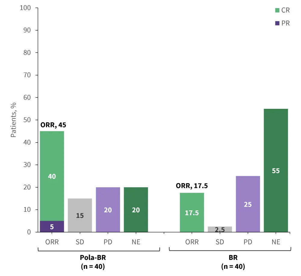BR, bendamustine + rituximab; CR, complete response; DLBCL, diffuse large B-cell lymphoma; NE, not evaluable; ORR, overall response rate; PD, progressive disease; PR, partial response; Pola-BR, polatuzumab vedotin + bendamustine + rituximab; R/R, relapsed/refactory; SD, stable disease.