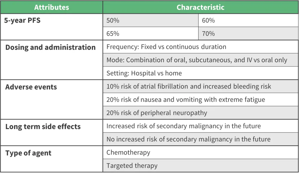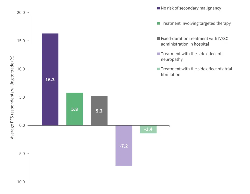 Patients were willing to trade treatment efficacy to receive a treatment with certain attributes, such as no increased risk of secondary malignancy, a fixed duration treatment with intravenous or subcutaneous administration at the clinic, or a treatment containing targeted therapy. On the other hand, patients were only willing to accept a treatment with atrial fibrillation or neuropathy as a side effect if they received a 1.4% and 7.2% increase in treatment efficacy, respectively (Figure 2).
