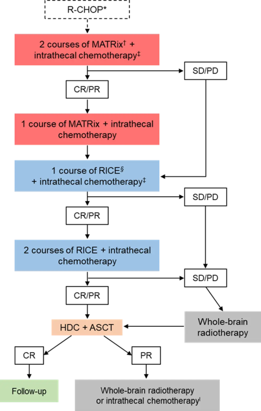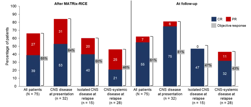 CNS, central nervous system; CR, complete response; MATRix, rituximab, methotrexate, cytarabine, and thiotepa; PR, partial response; RICE, rituximab, etoposide, ifosfamide, and carboplatin.