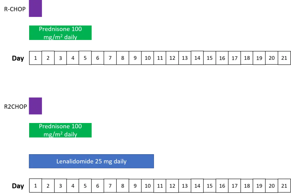 R-CHOP, rituximab plus cyclophosphamide, doxorubicin, vincristine, and prednisone. R2CHOP, lenalidomide + R-CHOP. |