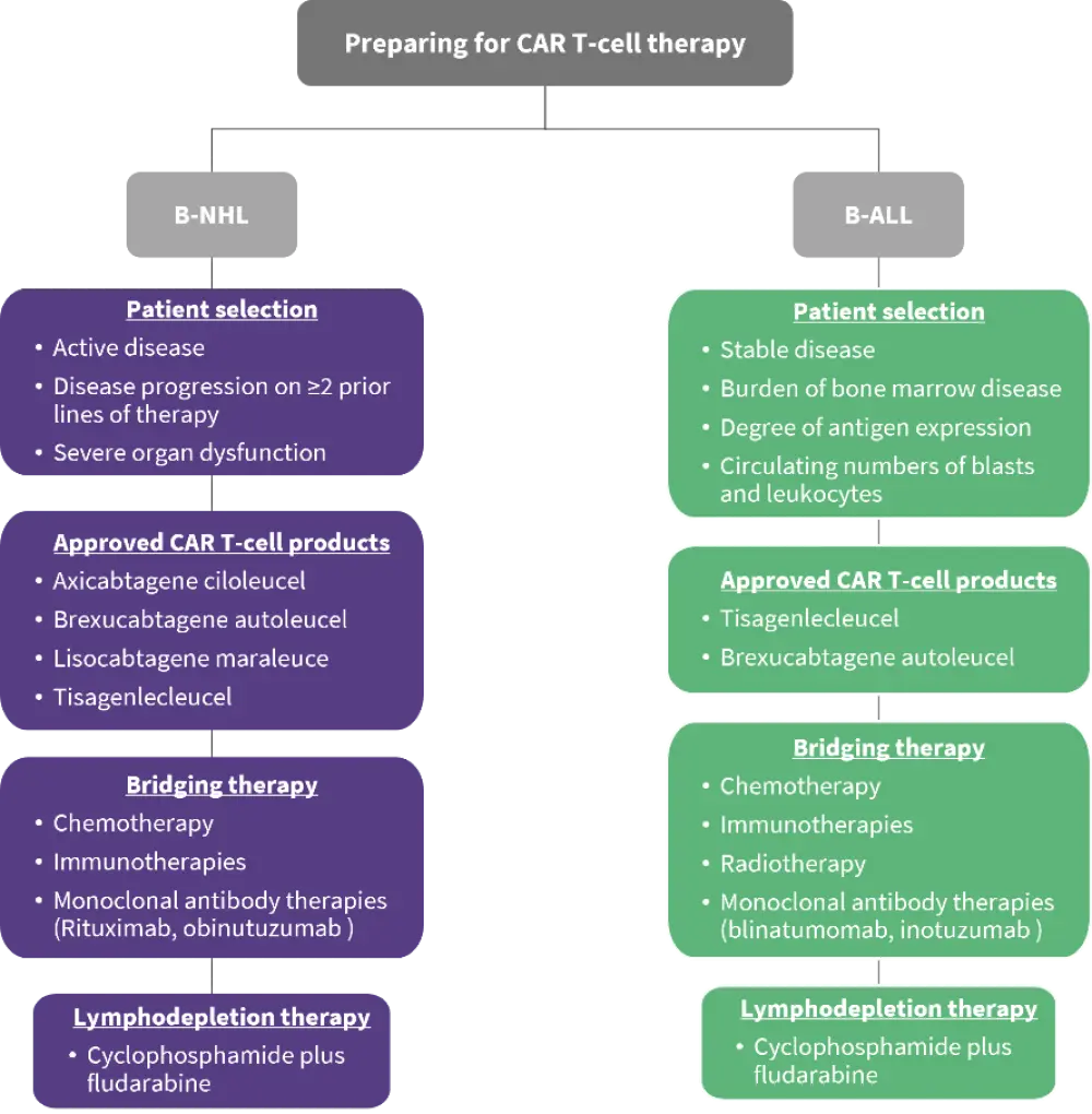 Here, we provide a summary of the recently published review article by Amini, et al., in Nature Reviews Clinical Oncology,1 on the many considerations for preparing patients with B-cell non-Hodgkin lymphoma (B-NHL) or acute lymphoblastic leukemia (B-ALL) for CAR T-cell therapy and provide future perspectives on this important treatment area.