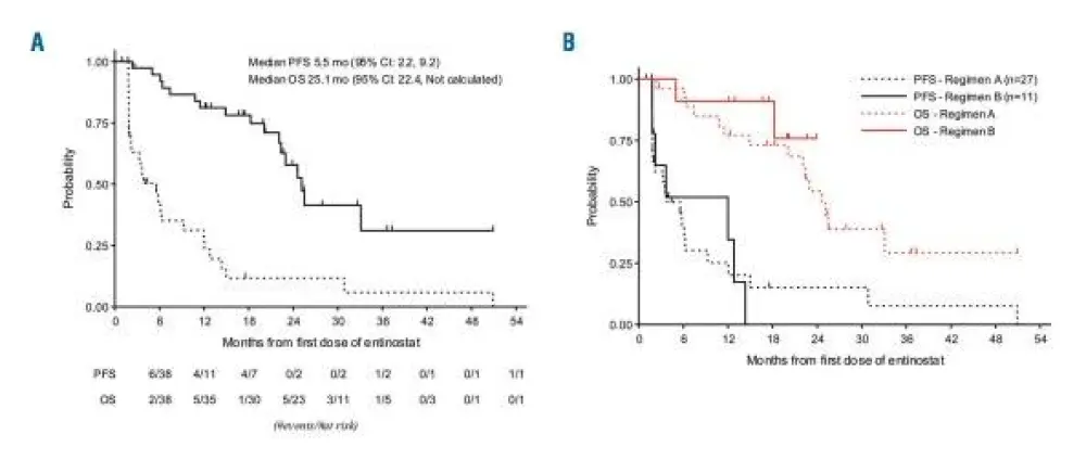 They treated 33 patients with oral entinostat once every other week (schedule A) and 16 patients once weekly in 3 of 4 weeks (schedule B). Their key findings were: