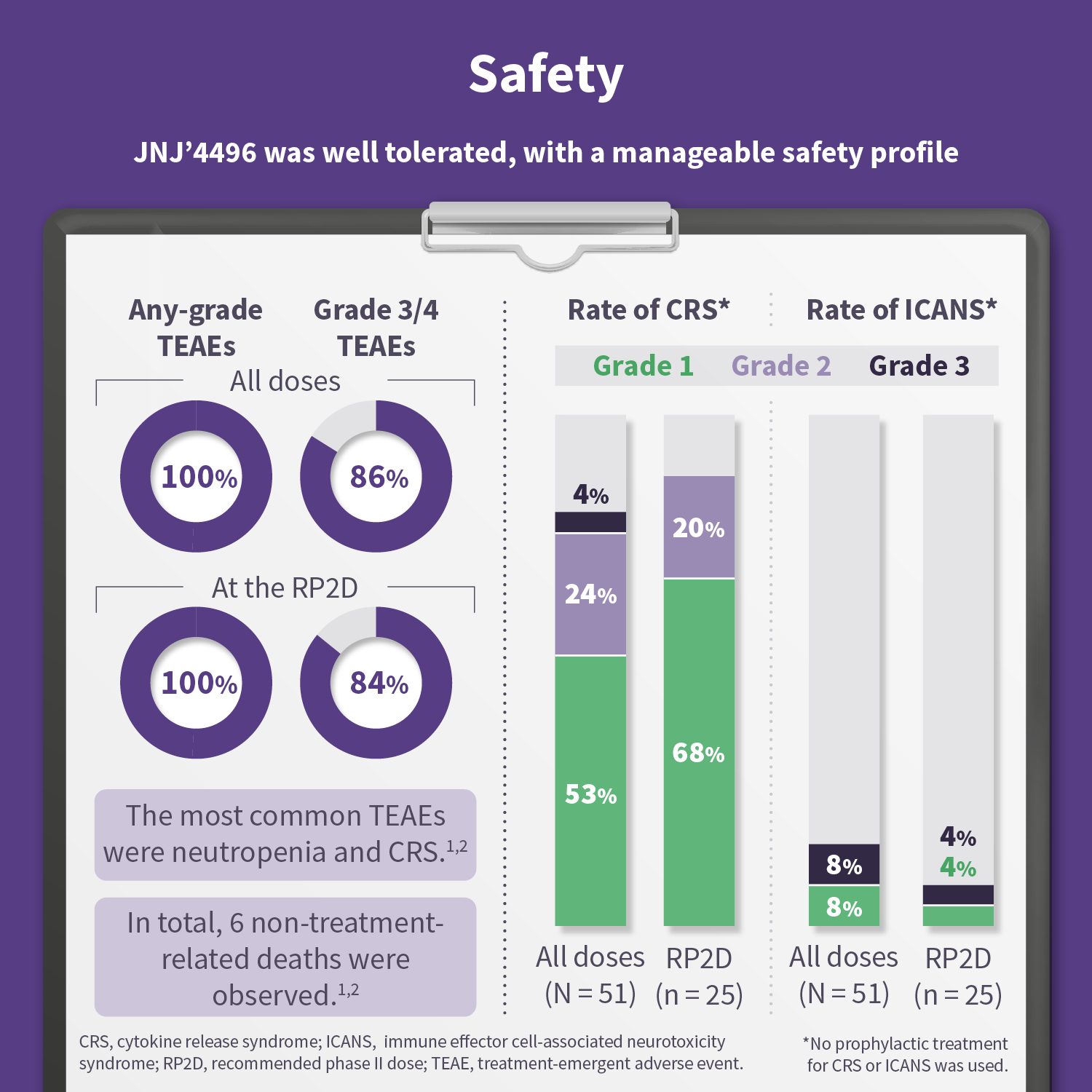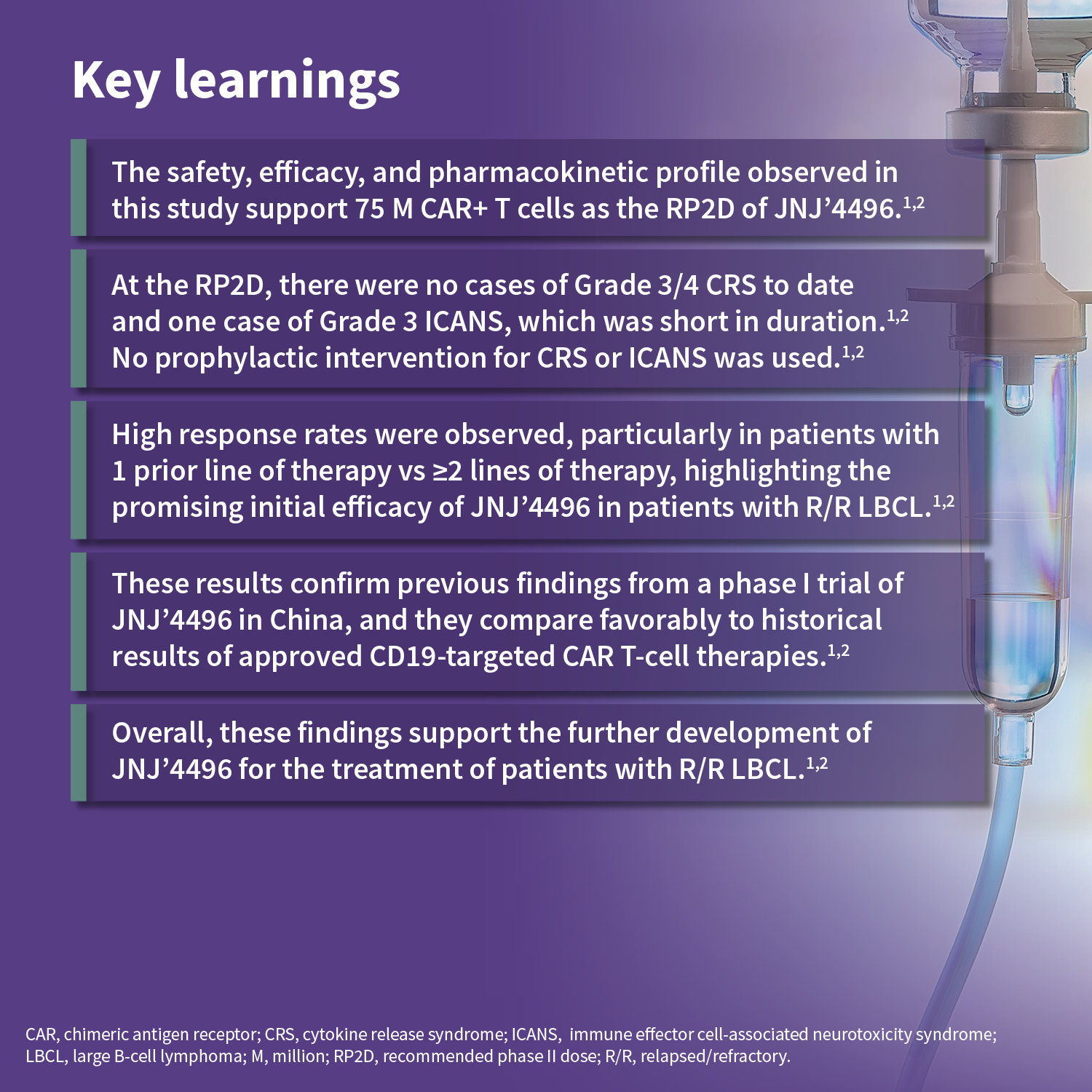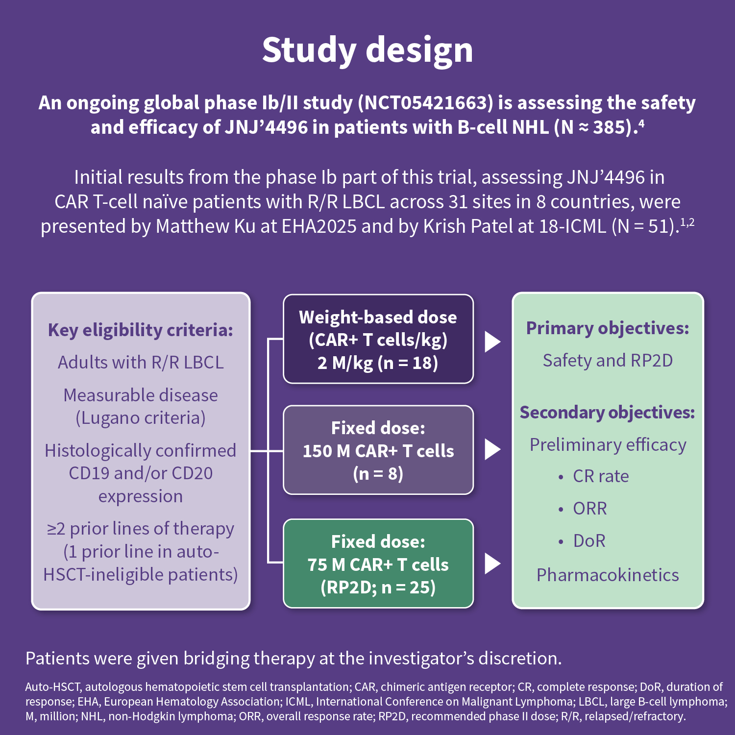 At the European Hematology Association (EHA) 2025 Congress and the 18th International Conference on Malignant Lymphoma (ICML) Matthew Ku, and Krish Patel, respectively, discussed the first results from a phase Ib study (NCT05421663) investigating JNJ-90014496 (formerly C-CAR039), a CD19/CD20 bispecific chimeric antigen receptor (CAR) T-cell therapy, in patients with relapsed/refractory large B-cell lymphoma (N = 51). 75 M CAR+ T-cells was selected as the recommended phase II dose, with an overall response rate and complete response rate of 96% and 77%, respectively.