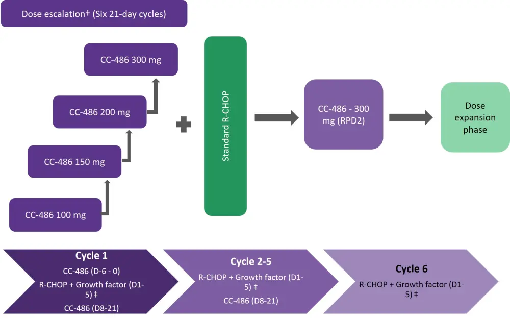 The treatment schedule comprised six 21-day cycles of CC-486 evaluated at escalating doses of 100, 150, 200, or 300 mg. CC-486 was administered orally once daily for 7 days as a priming regimen (Figure 1) prior to initiation of R-CHOP on Day 1 of Cycle 1; thereafter, CC-486 was administered daily for 14 days during Cycles 1−5 of R-CHOP.
