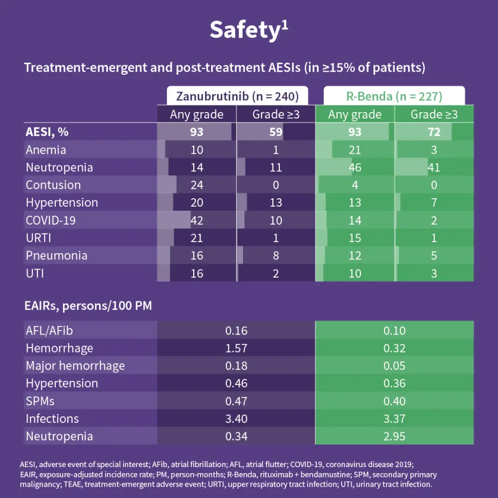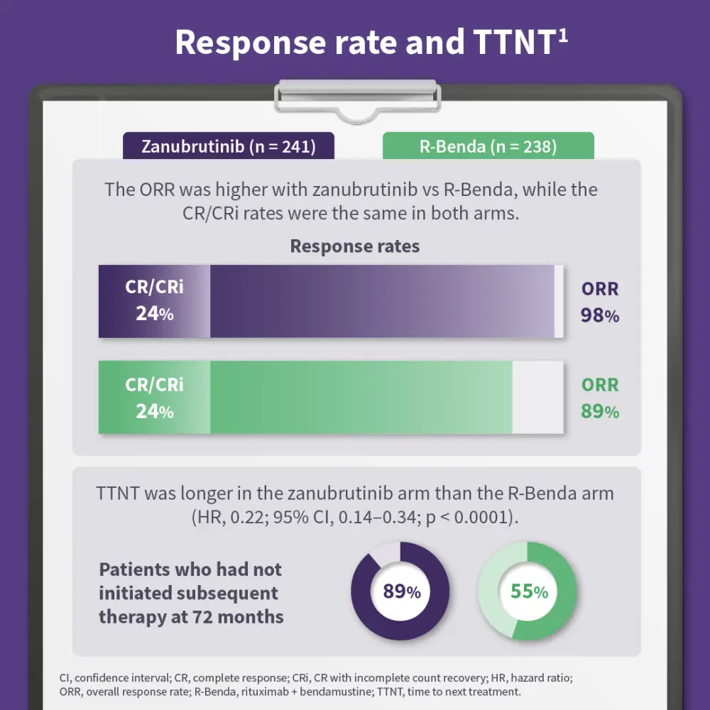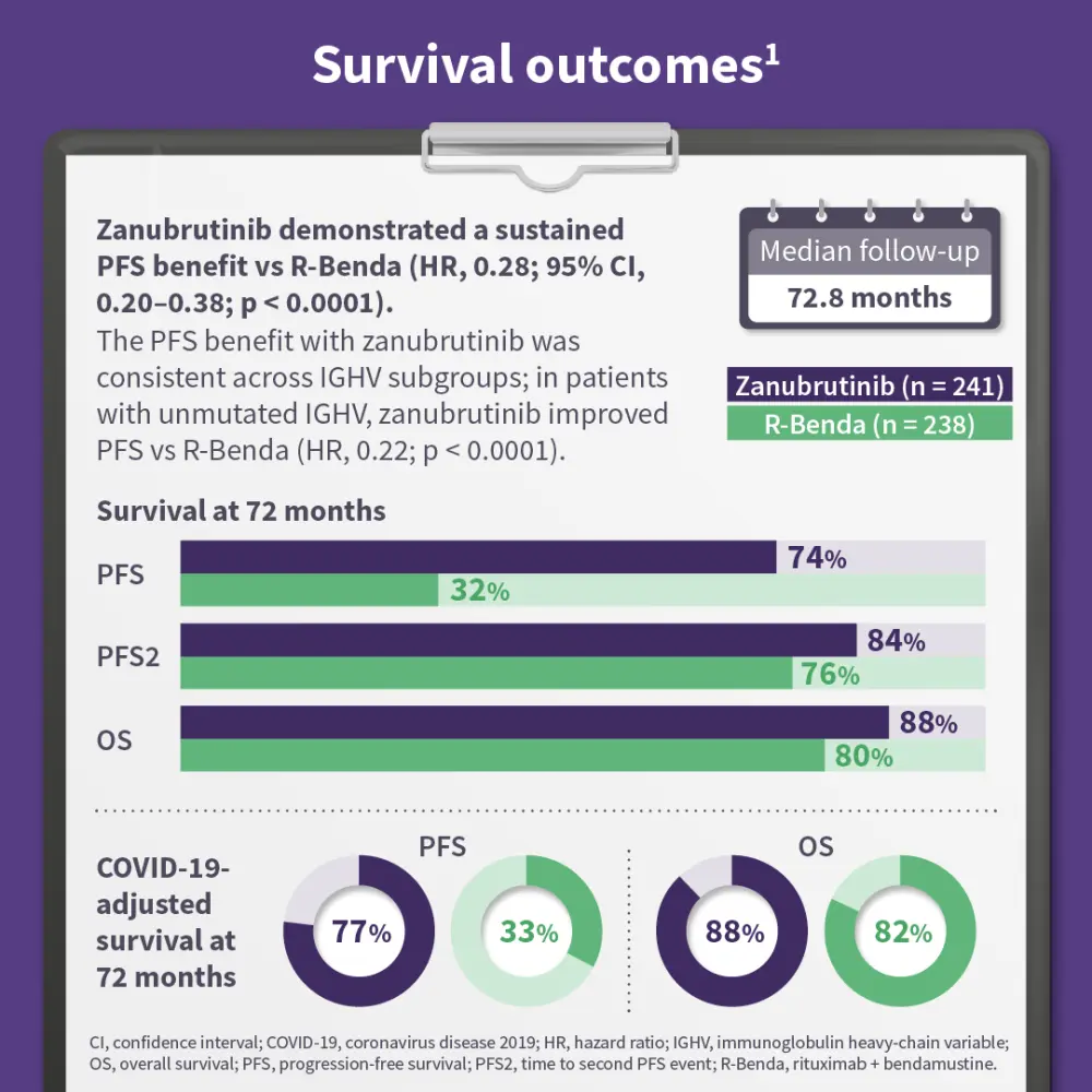 Results from arms A and B of the open-label, randomized phase III SEQUOIA trial previously demonstrated that zanubrutinib improved progression-free survival (PFS) vs rituximab + bendamustine (R-Benda) in patients with TN CLL/SLL without del(17p) at 26.2 months of follow-up.1 As previously covered on the Lymphoma Hub, 5-year PFS from arms A and B of this trial remained higher for zanubrutinib (75.8%) than R-Benda (40.1%).1 Now, the most recent data at 6 years of follow-up show that the PFS benefit of zanubrutinib (74%) vs R-Benda (32%) was sustained.1