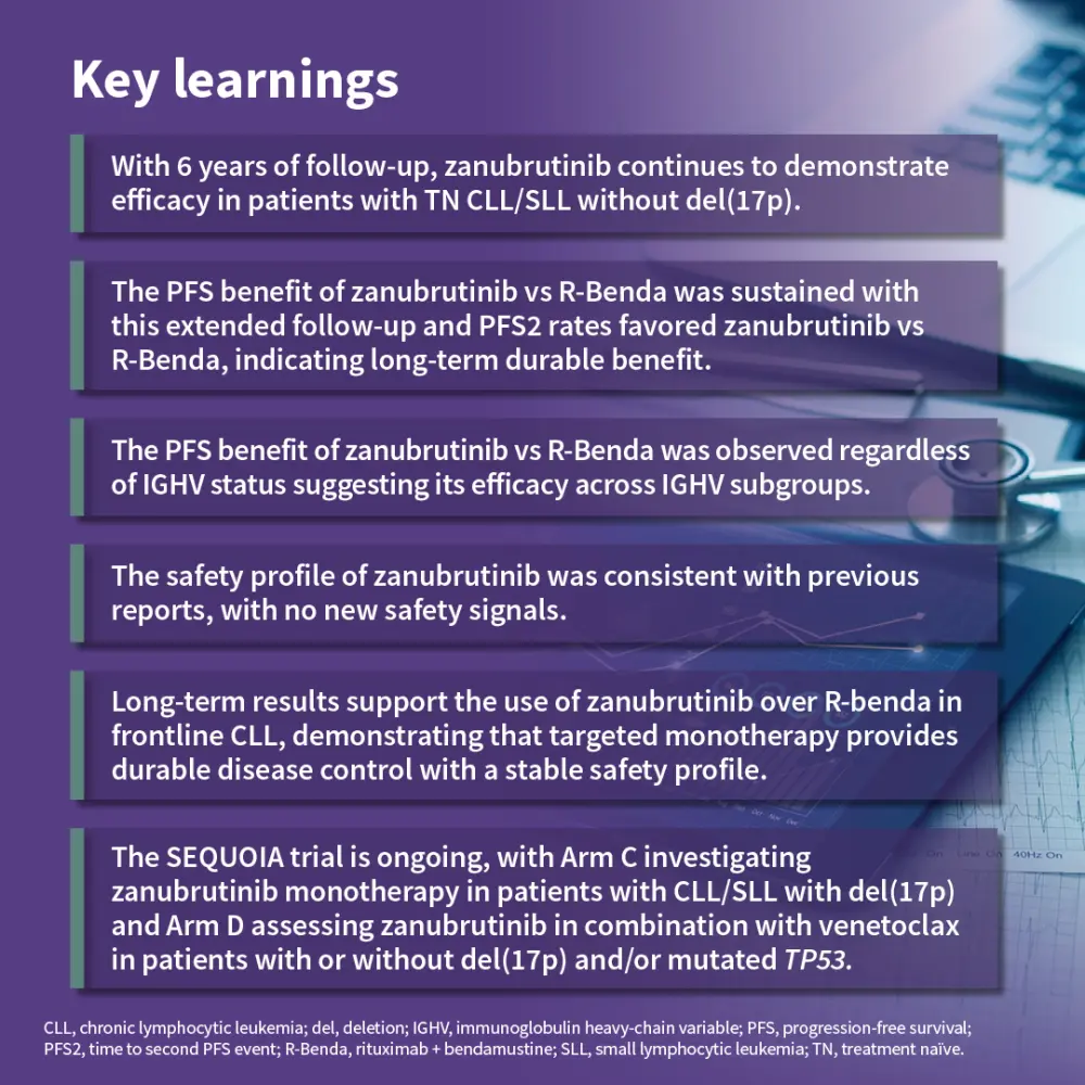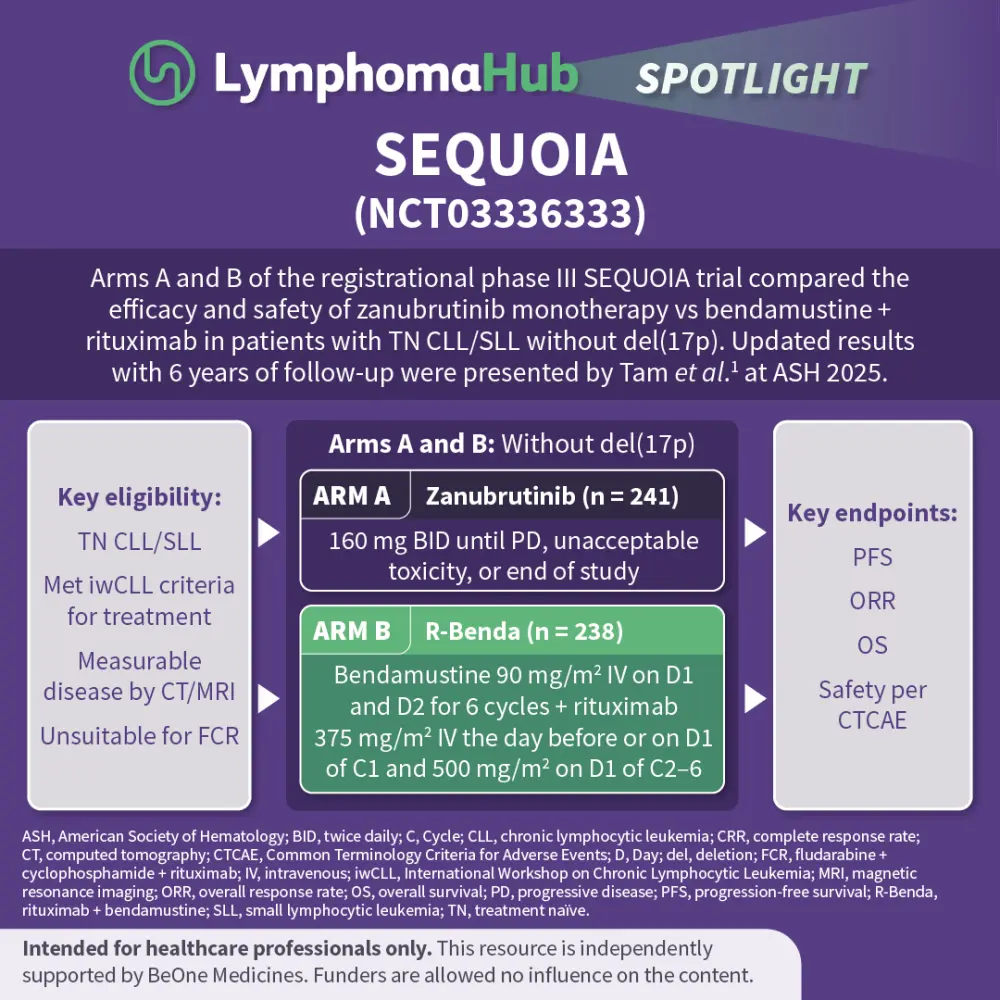 During the 67th American Society of Hematology (ASH) Annual Meeting and Exposition 2025, December 6–9, 2025, Orlando, US, Constantine Tam presented updated 6-year follow-up results from arms A and B of the SEQUOIA (NCT03336333) trial.1 Results continue to support the use of zanubrutinib as an effective and tolerable first-line therapy for patients with treatment-naïve (TN) chronic lymphocytic leukemia (CLL) / small lymphocytic lymphoma (SLL) without deletion (del)(17p).1