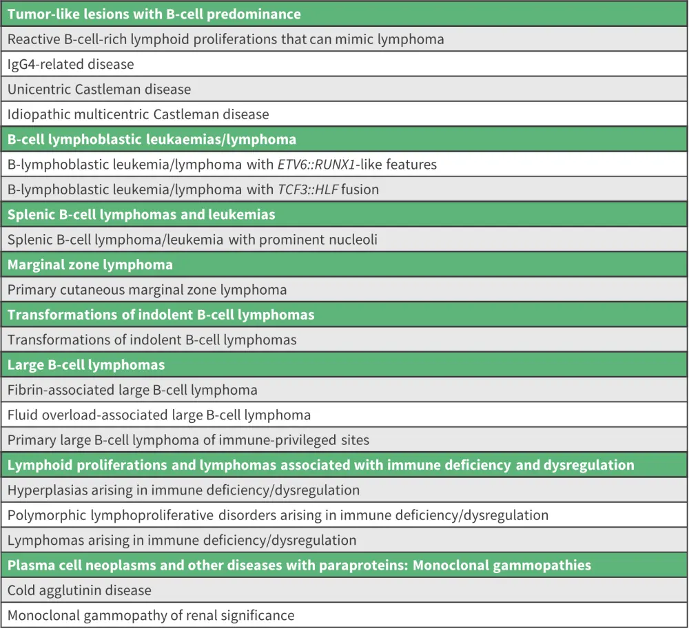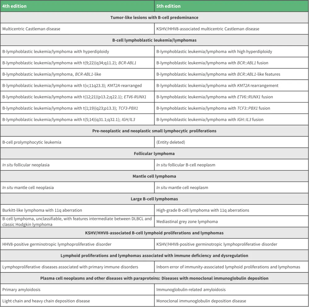Figure 2 and Figure 3 provide an overview of the changes and new additions to the B-cell lymphoid proliferations and lymphomas classification. Any classifications that remained the same have not been included in our summary.