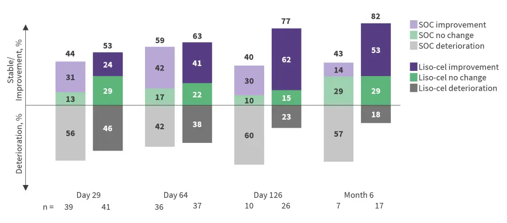 The proportion of patients with meaningful improvements in global health status/QoL was higher in the liso-cel arm, with also a lower proportion of patients deteriorating in comparison to the SOC arm from Day 126 to Month 6 (Figure 2). At Month 6, a tendency for improved pain scores in the liso-cel arm and deterioration in the SOC arm was noted.