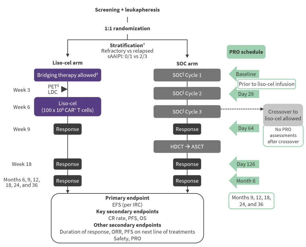 ASCT, autologous stem cell transplantation; CAR, chimeric antigen receptor; CR, complete response; EFS, event-free survival; HDCT, high-dose chemotherapy; IRC, independent review committee; LDC, lymphodepleting chemotherapy; liso-cel, lisocabtagene maraleucel; ORR, objective response rate; OS, overall survival; PET, positron emission tomography; PFS, progression-free survival; PRO, patient-reported outcome; R-DHAP, rituximab, dexamethasone, cytarabine, and cisplatin; R-GDP, rituximab, gemcitabine, dexamethasone, and cisplatin; R-ICE, rituximab, ifosfamide, carboplatin, and etoposide; sAAIPI, secondary age-adjusted International Prognostic Index; SOC, standard of care.