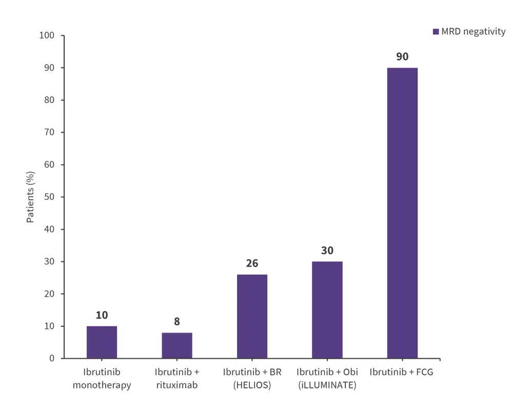 The Bruton’s tyrosine kinase inhibitor (BTKi) ibrutinib was initially indicated as second-line therapy in relapsed CLL and, more recently, as first-line therapy in newly diagnosed CLL.1 Despite its overall clinical efficacy and excellent survival outcomes, only a minority of patients treated with ibrutinib monotherapy achieved MRD negativity.3 A study reported PB MRD negativity rates of only 10.2% in both treatment naïve and relapsed/refractory patients after 5 years of continuous ibrutinib monotherapy1,3; CR rates were 37.5% and 21.3%, respectively, in the low MRD (<10−2) vs high MRD (≥10−2) group.1,3