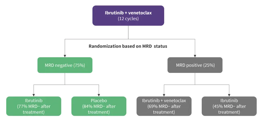 Examples of MRD-guided treatment strategies include a trial (NCT02629809) evaluating first-line treatment with ibrutinib, fludarabine, cyclophosphamide, and obinutuzumab (iFCG) in patients with a favourable genetic profile.3 BM MRD was assessed following three cycles of iFCG; those with uMRD received three additional cycles of ibrutinib and obinutuzumab and six more cycles of ibrutinib, while those not achieving uMRD received nine additional cycles of ibrutinib and obinutuzumab. In those who reached uMRD at 1-year, therapy was stopped.3 Another example is the CAPTIVATE trial (NCT02910583) which evaluated ibrutinib plus venetoclax in an MRD-guided cohort (Figure 5).1