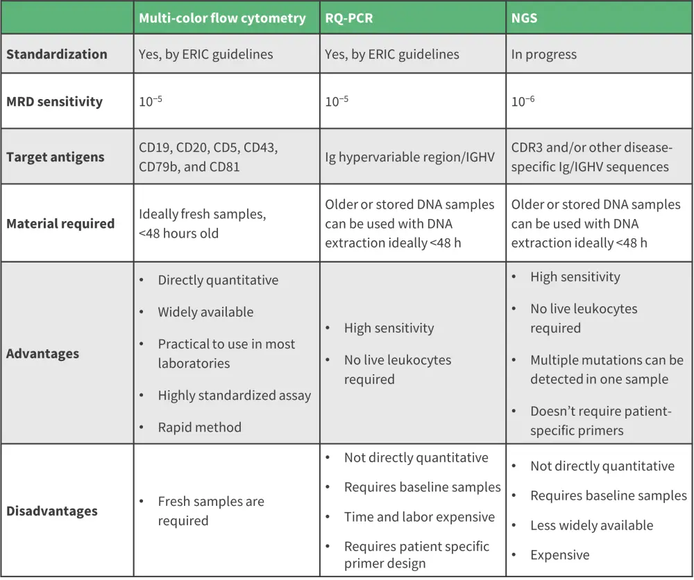 There are three methods used for MRD detection at a sensitivity level of <10−4: multicolor flow cytometry (MFC), real-time quantitative polymerase chain reaction (RQ-PCR), and next-generation sequencing.2,3 Although each method has differing sensitivity, target, standardization, advantages, and disadvantages, they can still be used as complementary tools for comprehensive MRD detection (Figure 1).1,3 The final choice of MRD detection method will depend on each laboratory set up and the purpose for MRD monitoring.2