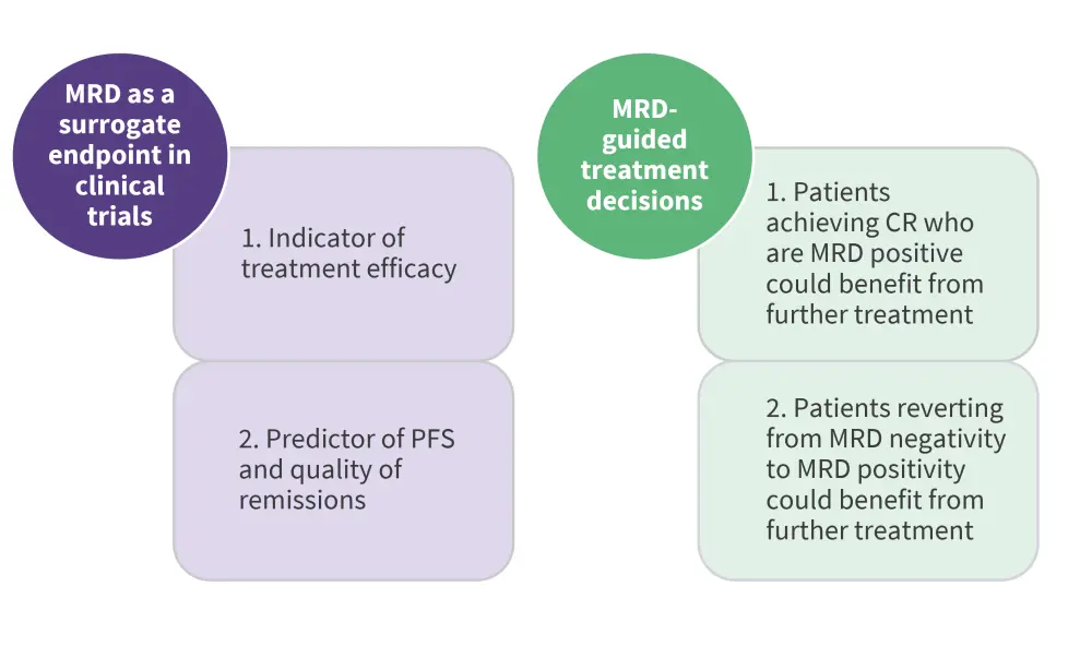 The prognostic value of MRD status on survival outcomes has been demonstrated with chemoimmunotherapy and cellular therapies,3 although there is heterogeneity in responses among new targeted therapies.1 In addition, MRD has facilitated faster reporting of treatment outcomes than standard PFS and OS endpoints.1,2 While the prognostic significance of MRD assessment in clinical trials is established, its role in routine clinical practice has not yet been well defined.3