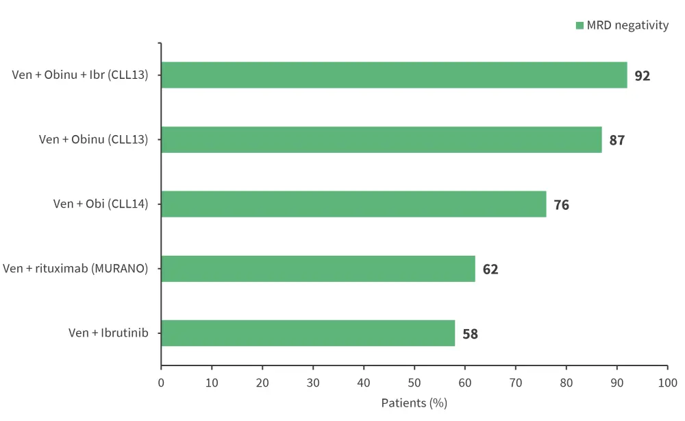 High MRD negativity rates have been achieved by several trials investigating venetoclax combined regimens, as shown in Figure 3. In the MURANO (NCT02005471) and CLL14 (NCT02242942) trials, high MRD negativity in the treatment vs comparator arm also translated into a prolonged PFS.1,3