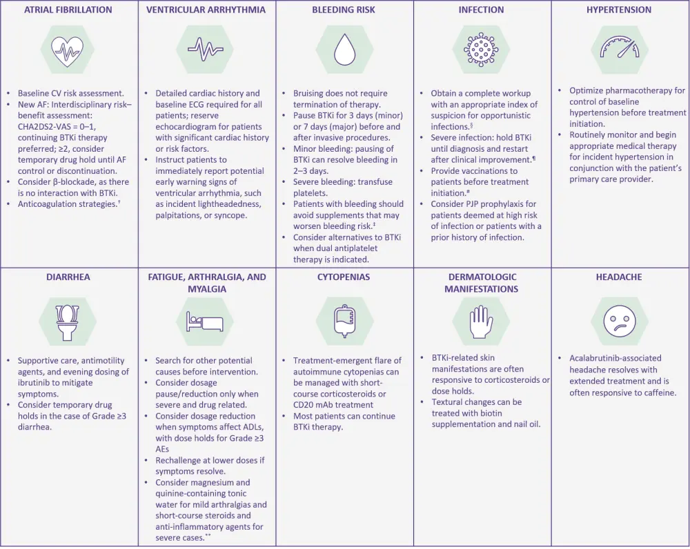 Ibrutinib has been the most extensively evaluated and has a well-defined toxicity profile. Clinically meaningful long-term AEs associated with ibrutinib include cardiac arrhythmias, bleeding, infection, diarrhea, arthralgias, and hypertension.3 The major toxicities linked to BTK inhibition, and how to manage them, are summarized in Figure 2.