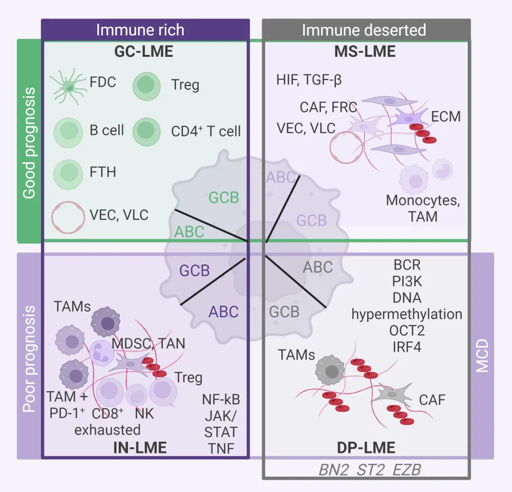 Using artificial intelligence-based computational analysis of transcriptional signatures, researchers have identified four major categories of LMEs in DLBCL with distinct characteristics (Figure 1):