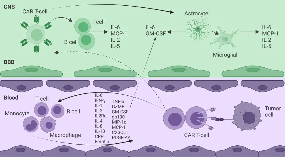 Immune effector cell-associated neurotoxicity syndrome is clinically characterized by neurological symptoms such as encephalopathy, tremors, dysgraphia, apraxia, and seizures caused by interactions between CAR T-cell and target cells that result in the activation and release of inflammatory factors (IL-6, monocyte chemoattractant protein-1, IL-2, and IL-5) in the central nervous system. Moreover, the destruction of the blood–brain barrier may lead to the migration of CAR T-cells to the brain parenchyma causing an increase in cytokine and protein levels that leads to central nervous system inflammation and toxicity.