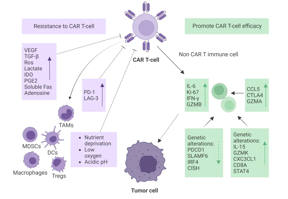 Physical barriers, immunosuppressive cells, inhibitory molecules, and immune checkpoints within the TME can contribute to resistance to CAR T-cell therapy. Nutrient deprivation, low oxygen levels, and acidic pH of the TME can negatively impact CAR T-cell survival, proliferation, and effector functions, limiting CAR T-cell activity and contributing to resistance. Additionally, the dense ECM and fibrotic stroma within the TME are physical barriers preventing effective penetration and infiltration of CAR T-cells into the tumor, thus limiting their ability to eliminate the tumor.