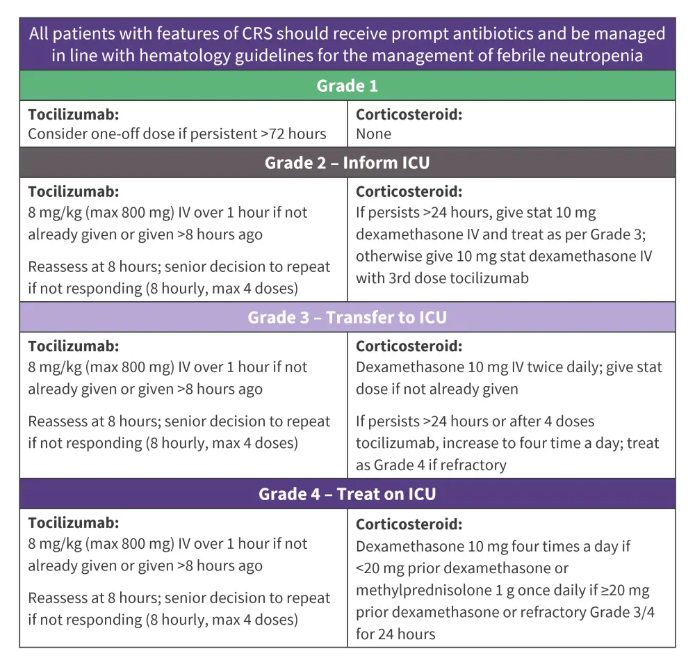 CRS, cytokine release syndrome; ICU, intensive care unit; IV, intravenously.