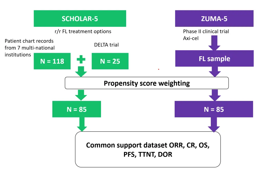 This study used cross-study comparisons of the retrospective SCHOLAR-5 study with a prospective clinical trial, the phase II ZUMA-5 trial. The design of the study is shown in Figure 1. SCHOLAR-5 is an external control cohort that was produced to allow for comparisons with the patients on the ZUMA-5 trial. To make the characteristics between the cohorts balanced, propensity score weights were used, after which the only category that was significantly different between groups was the Eastern Cooperative Oncology Group (ECOG) score (p < 0.05). As all patients were either 0 or 1, the investigators did not deem this to be clinically significant.